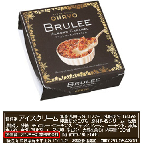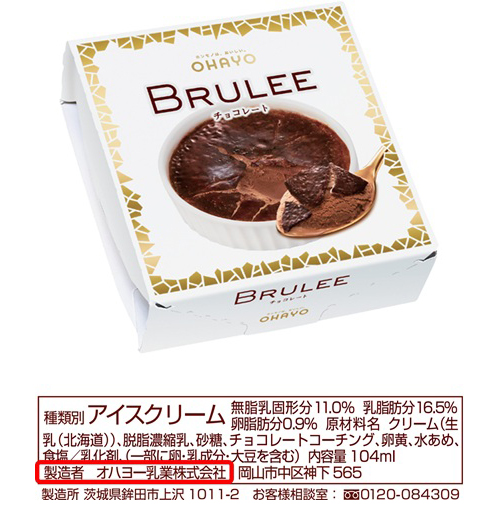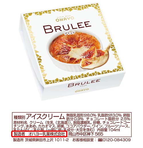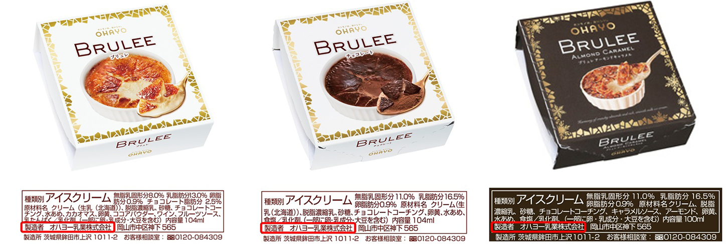 同社が製造・販売する「BRULEE(ブリュレ)」のパッケージには、同社ロゴマークの「OHAYO」の表示や、製造者として「オハヨー乳業株式会社」と明記しております。「BRULEE(ブリュレ)」をお求めの際は、パッケージ上のロゴマークや製造者の表示をご確認いただきますようお願い申し上げます。